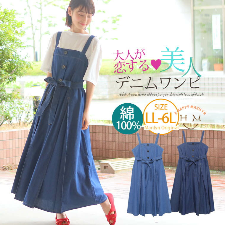 大きいサイズ レディース ワンピース | タックが美人な大人のデニム ウエストリボン ジャンパースカート _ オリジナル ワンピース ジャンスカ LL 3L 4L 5L 6L 夏 夏物 夏服 夏用 ぽっちゃり かわいい おしゃれ お腹 胸周り お尻 ライトオンス [330130] OMMOP ninkiop