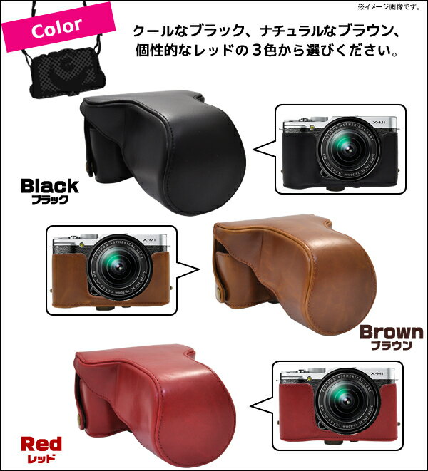 送料無料【FUJIFILM X-M1 ダブルレンズキット対応 カメラケース&首さげ・肩掛け可能ネックストラップ】ブラック/レッド/ブラウン 三脚使用可能 (合成皮革 黒色 富士フィルム デジカメケース カメラバック)
