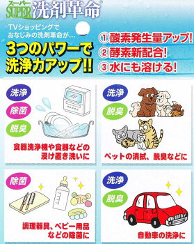 【内容量】300g【材質】本体容器、スプレー容器、キャップ、スプーン、説明書袋 :プラスチック / 説明書、ラベル :紙【成分】炭酸塩、炭酸カリウム、重炭酸塩、界面活性剤6.6%(ポリオキシエチレン、ポリオキシプロピレンアルキルエーテル、ポリオキシエレンアルキルエーテル)、酵素【セット内容】SUPER洗剤革命300g、スプレーボトル×1製造国:日本【送料について】北海道、沖縄、離島は別途送料を頂きます。